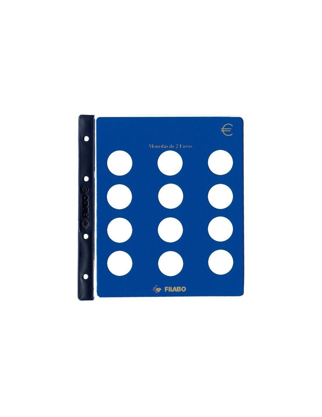 Hoja de cartón reforzado especial de 4 anillas en color azul de inserción fácil y segura con encaje perfecto. Con estampación en Oro inalterable. Capacidad para 12 monedas de 2€.