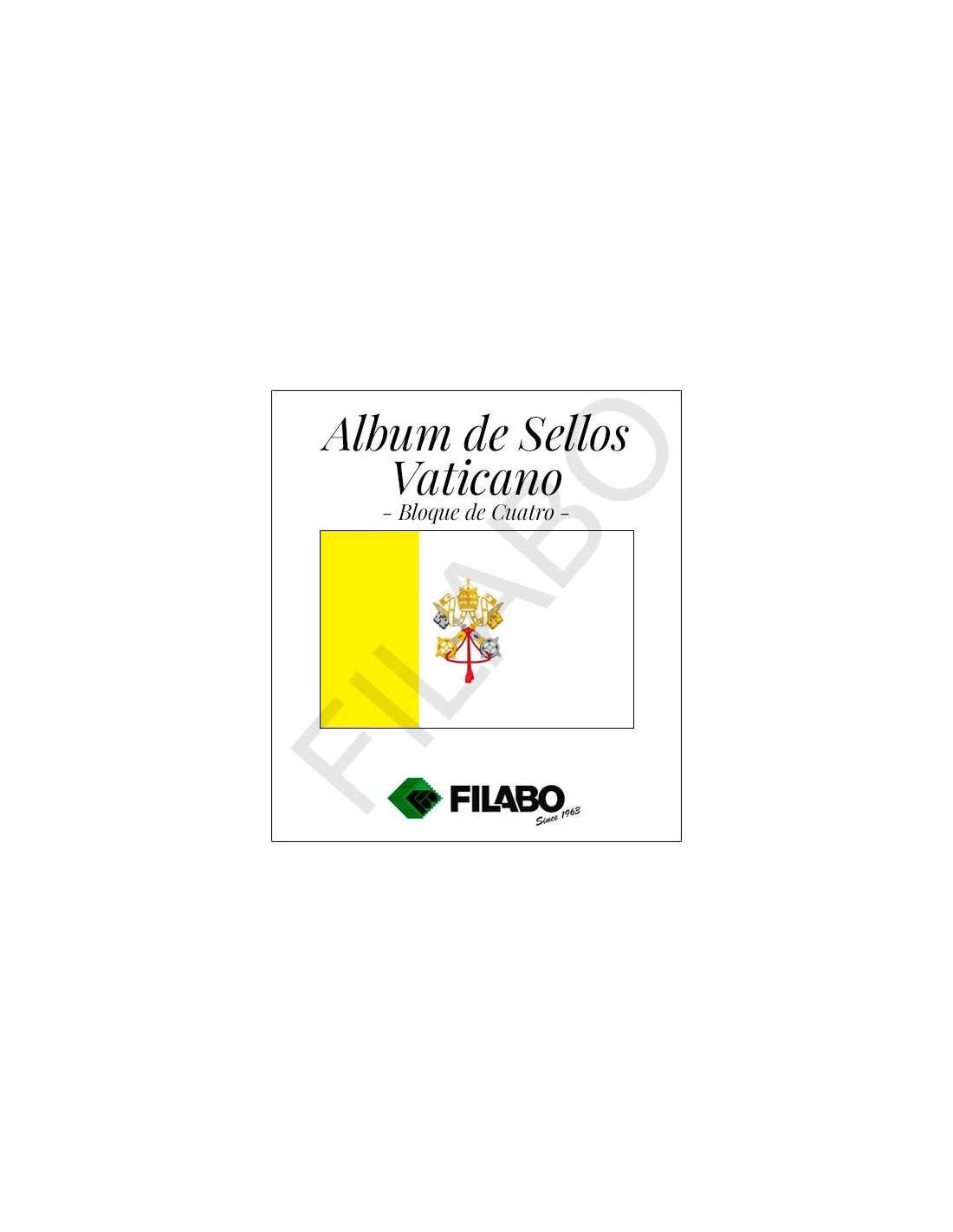 Las Hojas Filabo para colocar los Sellos Hojitas Bloque de Vaticano en Bloque de cuatro de cada año. Con todos los sellos fotografiados a color desde 1996. Se incluyen datos técnicos de su interés. Existen dos tipos de acabado de Primera Calidad en un sistema de 15 perforaciones: Cartulina Blanca y Registro Crema. Las Hojas se puede adquirir con los estuches protectores ya incorporados en fondo transparente o negro, de fibra Polyestirol neutro que garantiza su perfecta conservación en el tiempo.